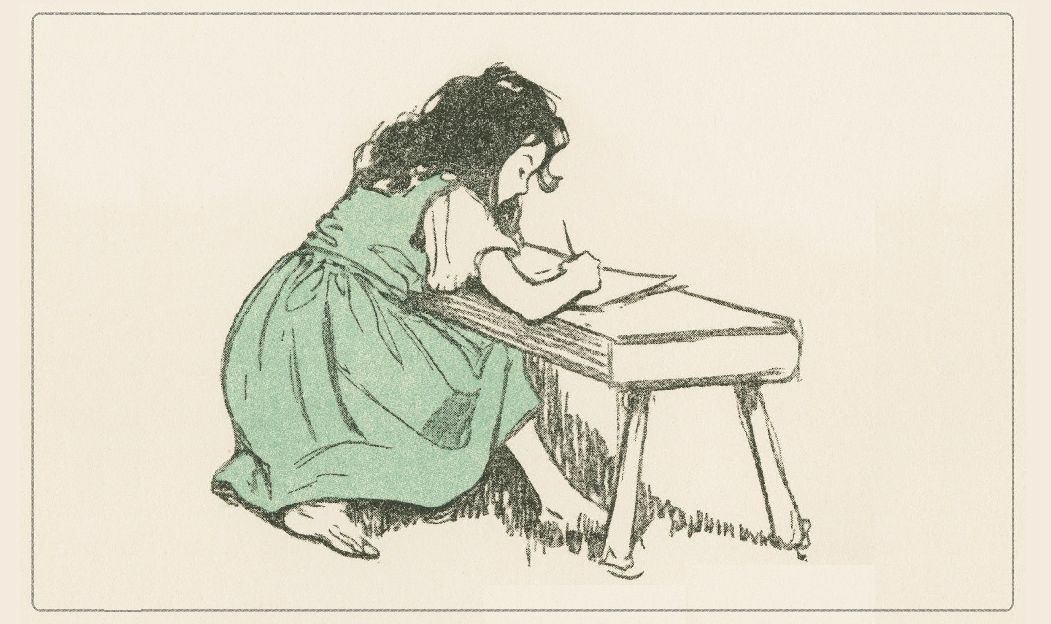 But the poem brings me to another letter writer bent over another kind of work. It’s me (predictably) and I’m six in Miss Cartmel’s first grade classroom where I very quickly had worked out reading and was hard at work on tracing out individual letters, lightly tattooed onto pulpy worksheets so I could make my own bolder lines. Again and again, cultivating craft, repeating forms with the same dedication as a Japanese apprentice potter making hundreds of the same cup until the master approves one, I drew them out. Miss Cartmel wasn’t so demanding, but I was a determined young calligrapher and something intensely valuable (I didn’t know what) was at stake in the training of my young, pliable muscles and bones.
